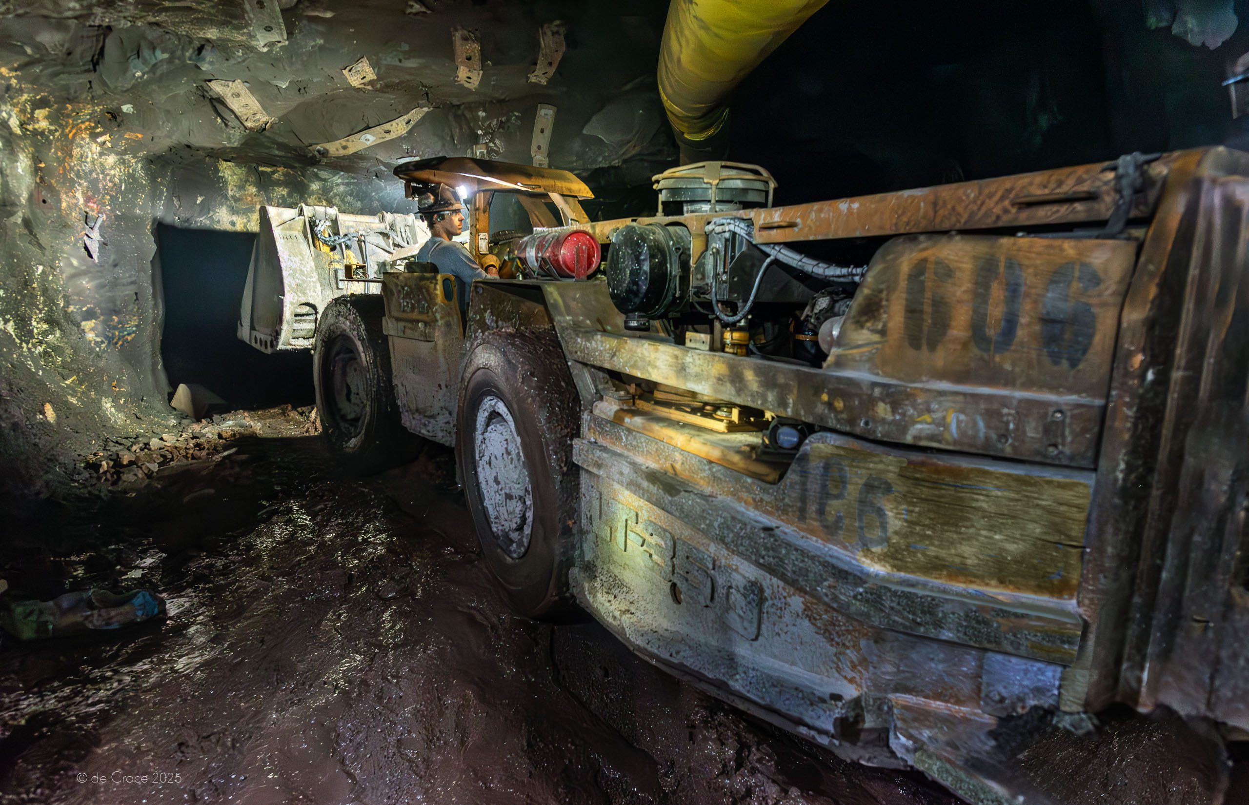 If you’re afraid of, or even uncomfortable in the dark, don’t go. Without moonlight or stars or a faint glow from a distant town, mines exists in total – zero light – darkness. Nights are inky black and it’s always especially irritatingly dark during the day. Of course, every miner has a headlamp on their hard-hats. And those lights come with a switch to increase or decrease intensity. So with the aid of lamps, miners do their job — they navigate through tunnels and break off chunks of rock. Vehicles have lights, of course. And the LHD (load-haul-dump) has lights on the front, on the sides and in the back. But an underground mining photographer can’t do much to control the direction or luminosity of those light sources. So we pack in light our own portable strobe lights.